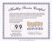 Look for the score! Healthy Service Certified Restaurants are required to display their certificate with their Health Department Score.